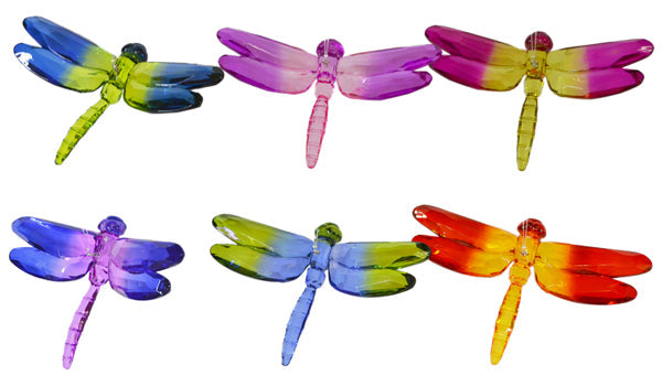 Two-tone coloured dragonfly ornament with a strong, clear filament for hanging.