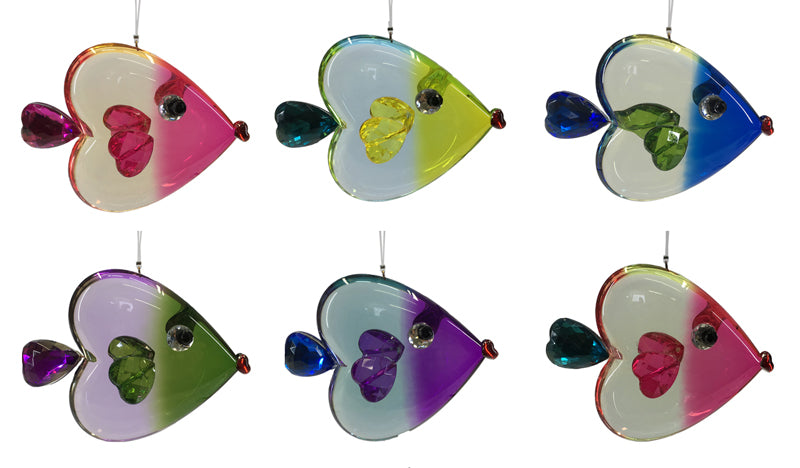 Coloured heart-shaped fish ornament with a strong, clear filament for hanging.