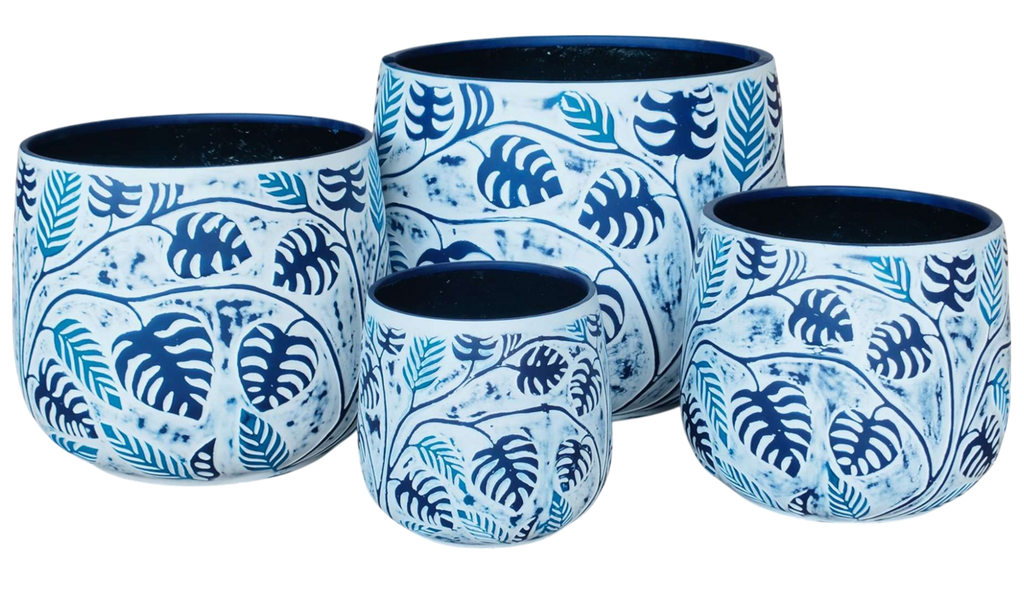 Bunge Monstera Fibreglass Pot - White with Blue Leaves