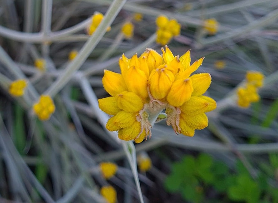 Ideal for planting in the ground or pots, Grey Cottonhead thrives in well-draining soils; those with poor, sandy soils should consider adding a quality soil conditioner for best results. Positioning the plant in full sun will encourage more vigorous flowering, although it can tolerate partial shade. Moderate watering, especially during Birak and Bunuru (summer), and a light application of a native fertiliser during Makuru (winter) will ensure it remains healthy and vibrant.