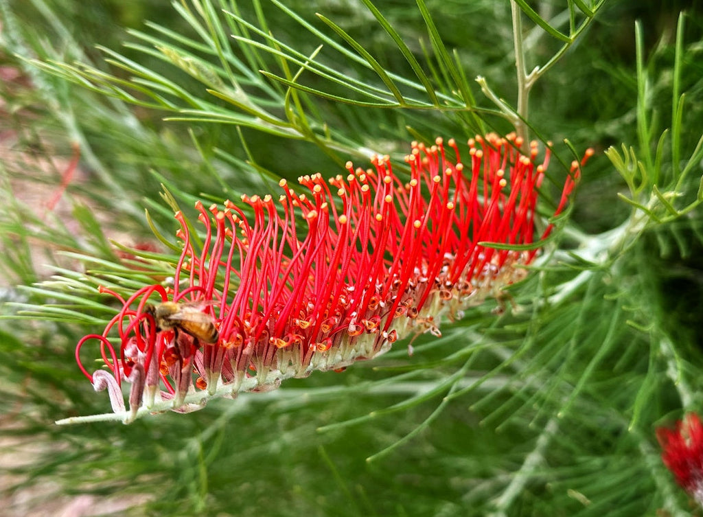"Scarlet Moon", a cultivar of Grevillea nivea x formosa 'Lasseters Gold', boasts bright red flowers year-round, providing consistent visual allure to any garden. This upright, medium to large sized shrub has silvery grey-green foliage which complements the stunning transition of its white flower buds that blossom into vibrant blooms. Loved by native Australian birds, this Grevillea, bred by Kings Park, is a testament to successful hybridisation, marrying beauty with resilience.