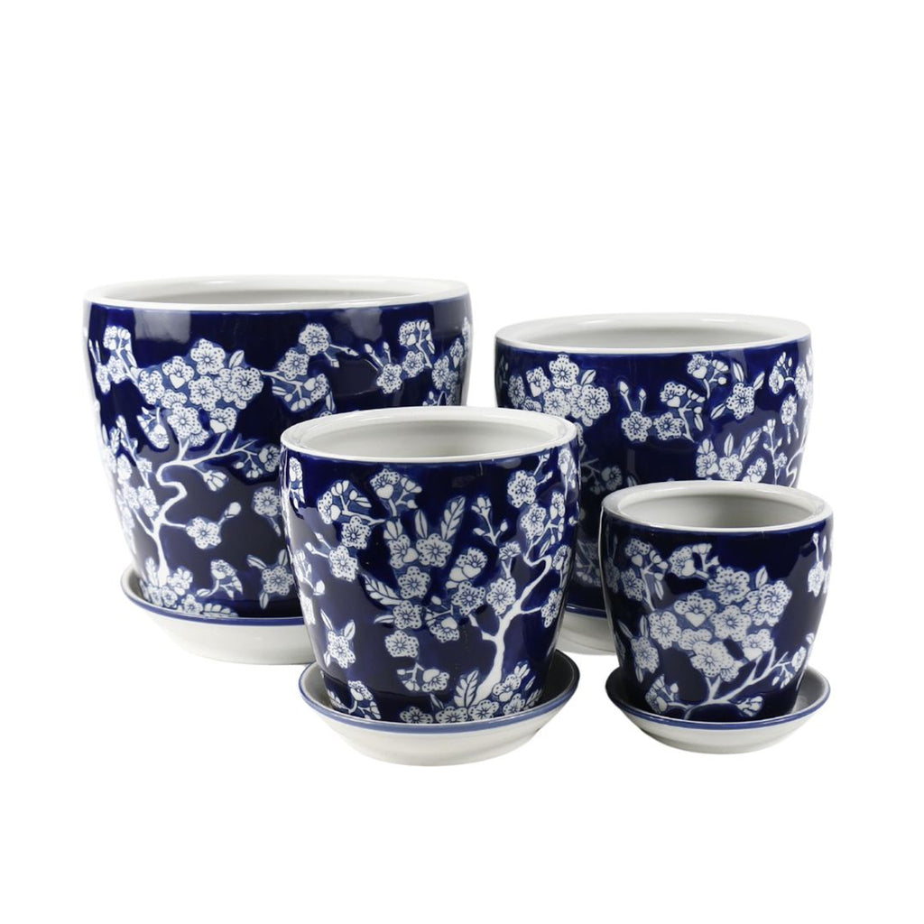 Round Ceramic Planter with Saucer - Navy Blue & White Cherry Blossom